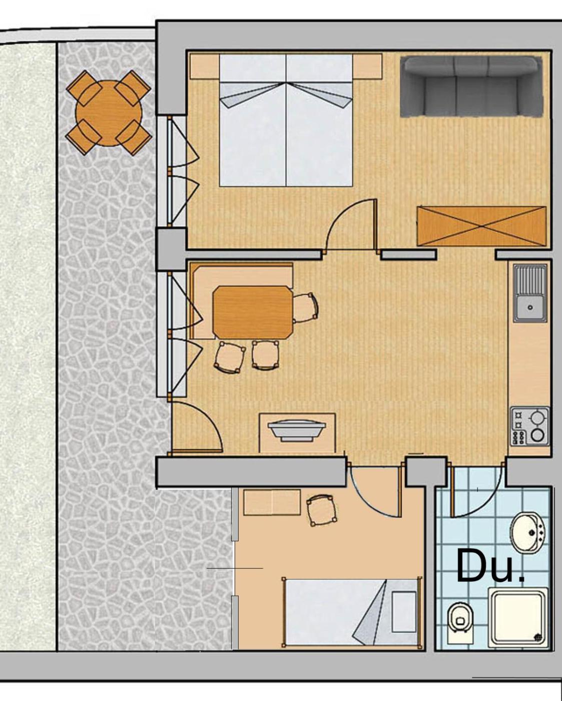One-Bedroom Apartment - Ground Floor. Alpine-style apartment with a mountain-view terrace, wooden furnishings, and parquet floors. WiFi is free. ;
