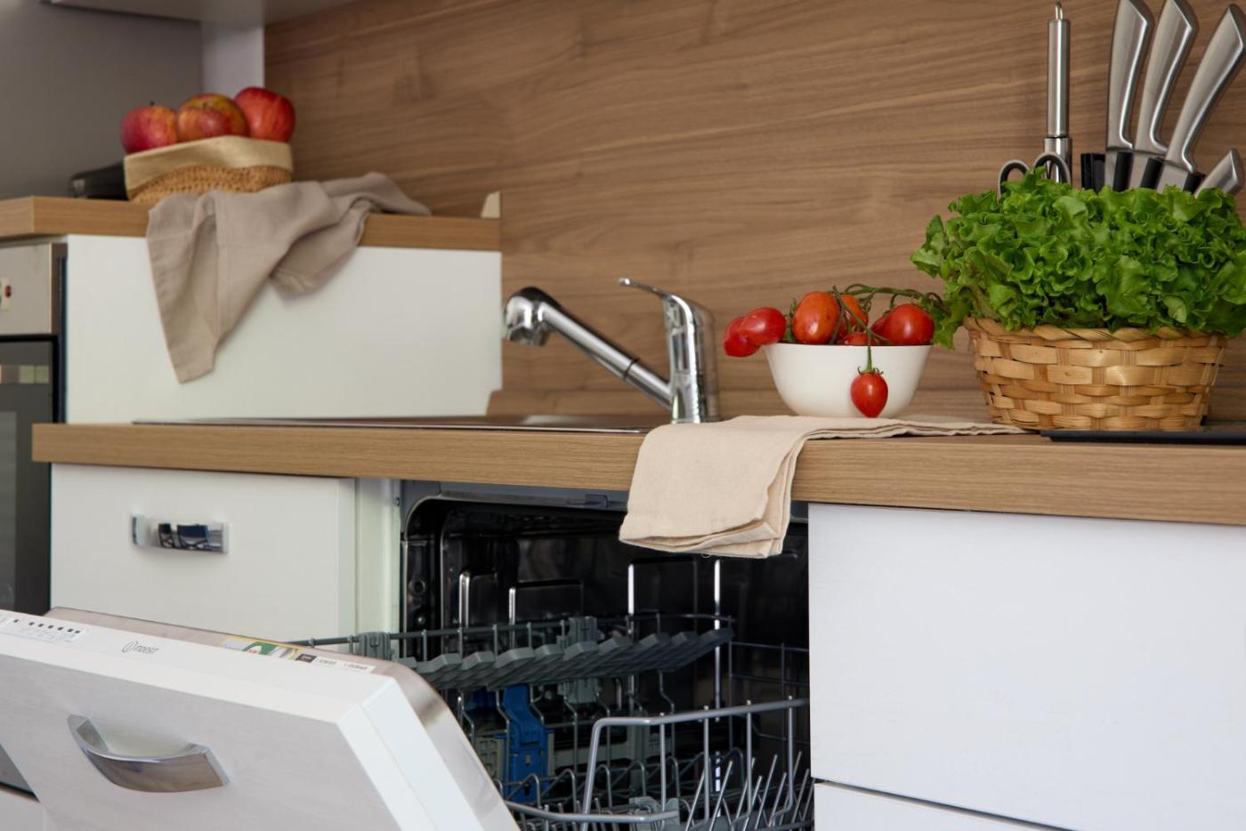 The 1-bedroom apartment is equipped with a living room with a TV, a fully equipped kitchen with a dishwasher and an oven, and 1 bathroom with a hair dryer.
