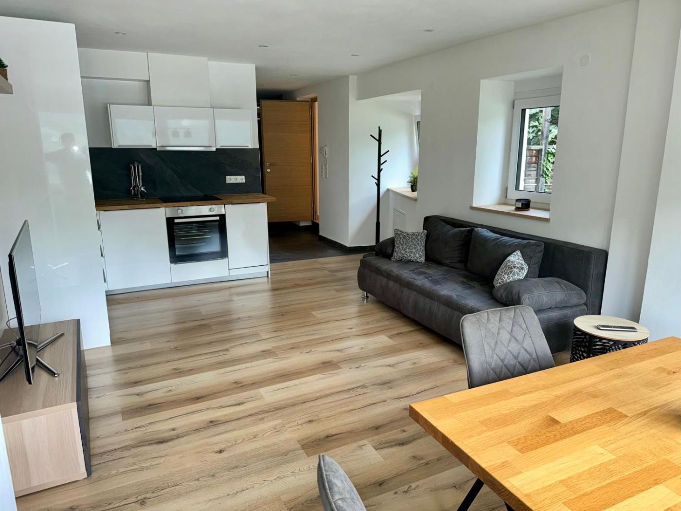 One-Bedroom Apartment. This spacious apartment comprises 1 living room, 1 separate bedroom and 1 bathroom with a shower and a bidet. Meals can be prepared in the well-fitted kitchen, which comes with a stovetop, a refrigerator, a dishwasher and an oven. The apartment provides a flat-screen TV, a washing machine, a private entrance, a coffee machine as well as garden views. The unit offers 2 beds.