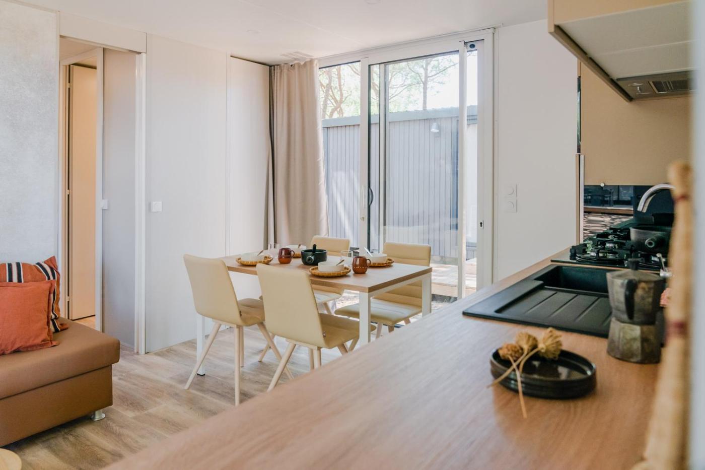 Mobile Home (5 Adults). Mobile home with 2 bedrooms, a living room with kitchenette and sofa bed, and a wooden patio. You can bring your own bed linen and towels or rent them on site. ;