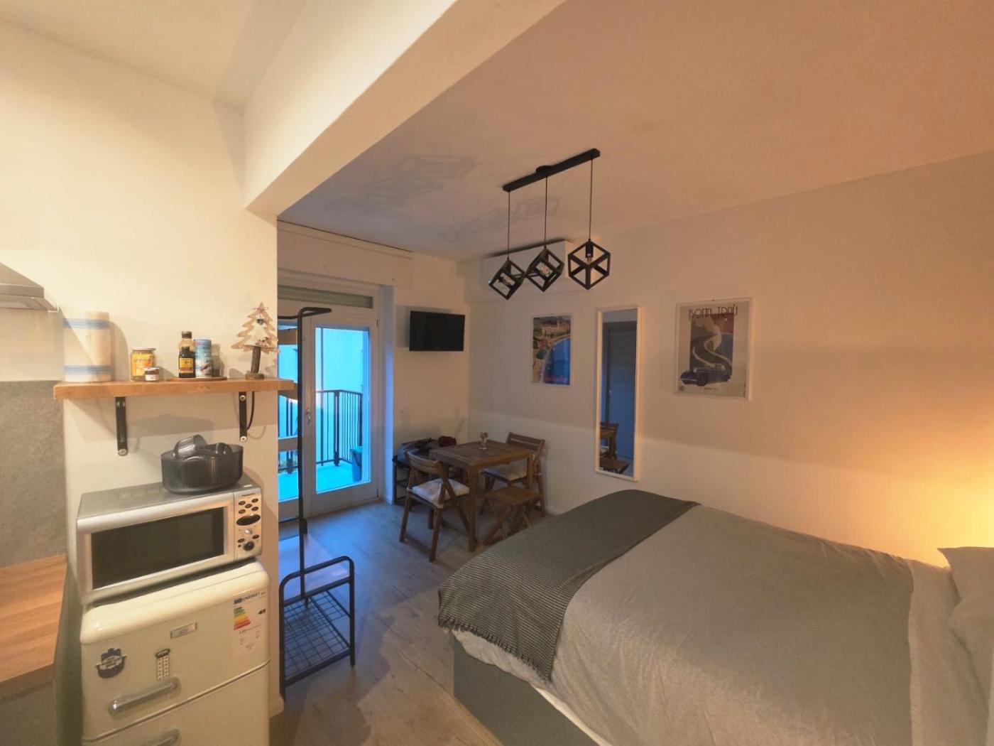 Studio Apartment with Queen Bed. This apartment comes with 1 living room, 1 separate bedroom and 1 bathroom with a shower and free toiletries. In the kitchen, guests will find a stovetop, a refrigerator, kitchenware and a microwave. Boasting a terrace with garden views, this apartment also features air conditioning and a flat-screen TV. The unit has 1 bed.