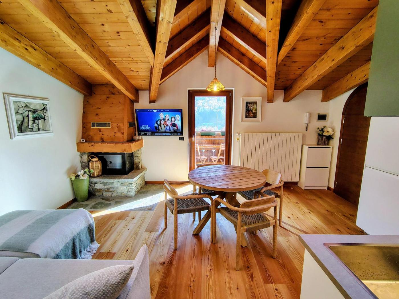 The apartment is equipped with 2 bedrooms, 1 bathroom, bed linen, towels, a flat-screen TV with streaming services, a dining area, a fully equipped kitchen, and a balcony with mountain views. There is also a seating area and a fireplace.