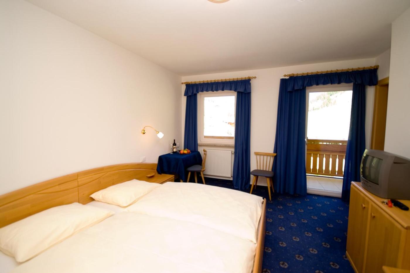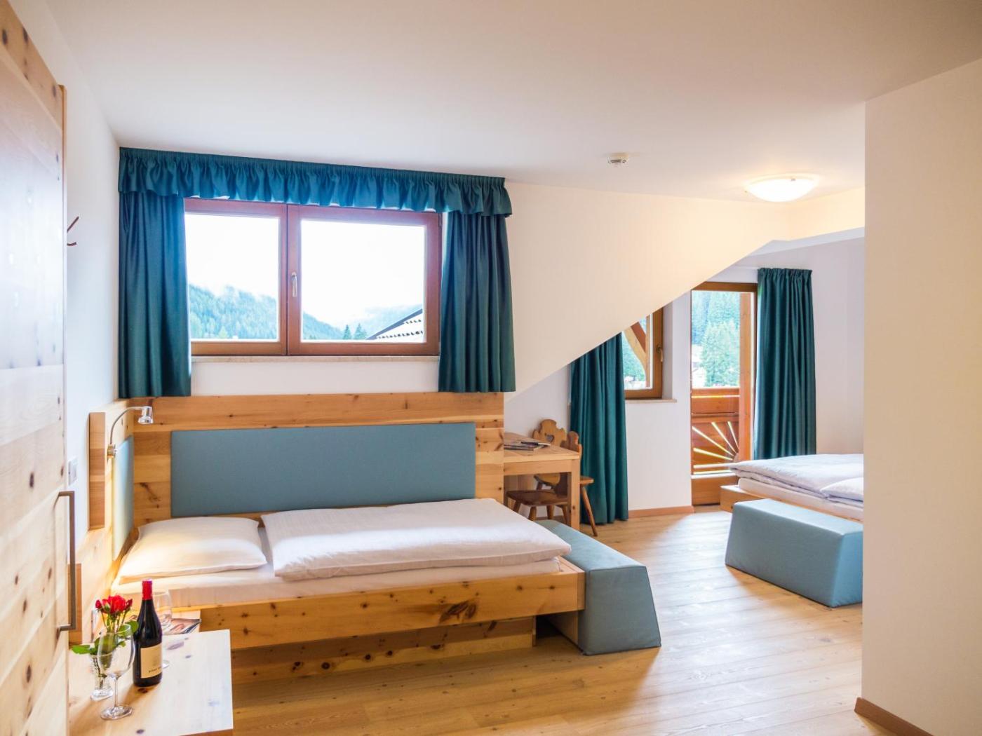Comfort Double Room with Balcony and Mountain View. The comfort is a modern room with wood floors and light wooden furniture, some made of Mugo pine. All rooms offer a furnished balcony with mountain views, plus an LCD TV with satellite channels. ;