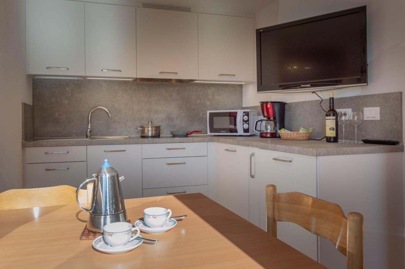 One-Bedroom Apartment. This apartment includes 1 bedroom, a kitchen and 1 bathroom with a walk-in shower and a hairdryer. In the well-equipped kitchen, guests will find a stovetop, a refrigerator, kitchenware and a microwave. The apartment offers a coffee machine, a dining area, a wardrobe, a flat-screen TV with satellite channels, as well as mountain views. The unit has 1 bed. ;